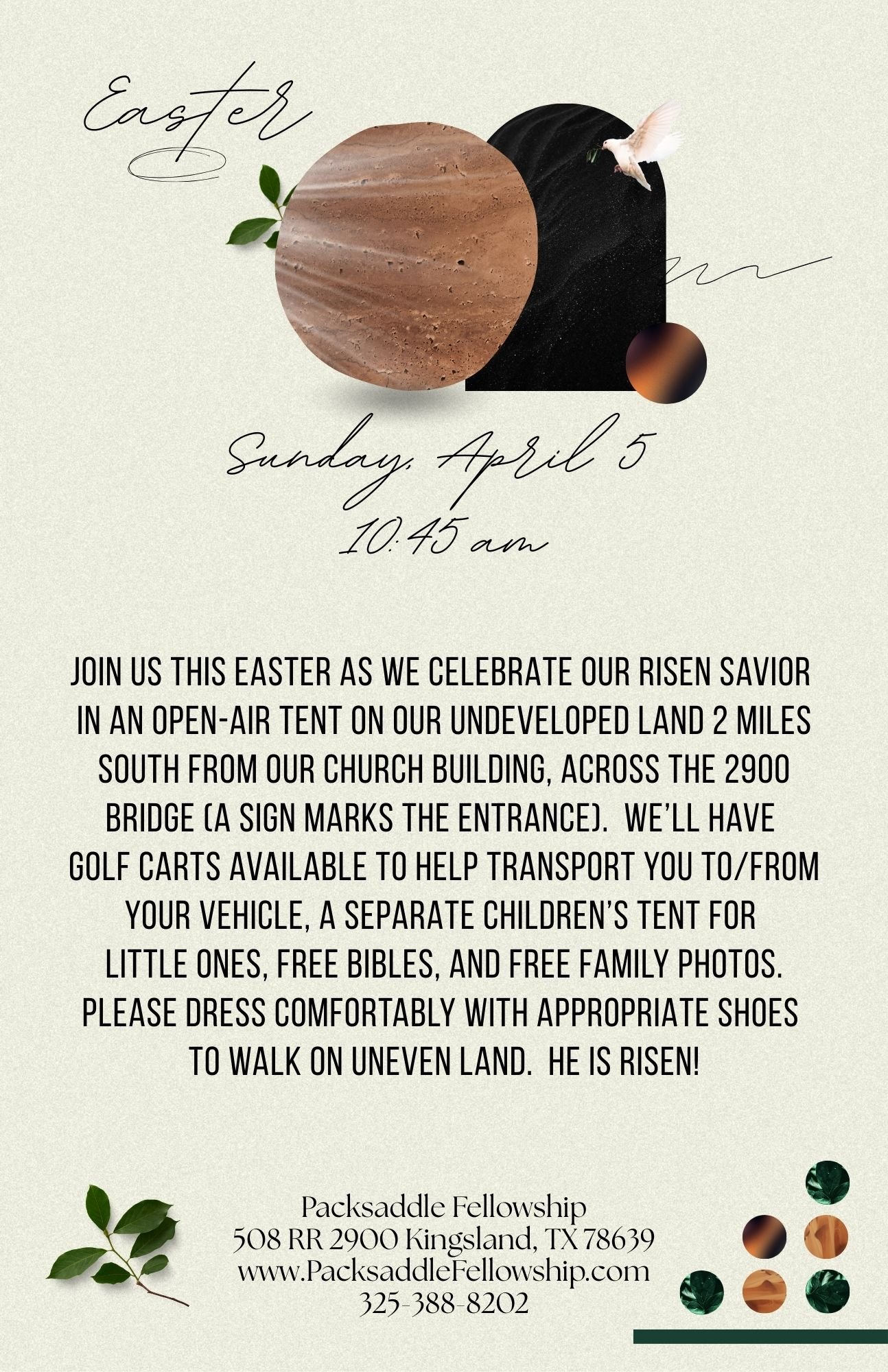 - April 5: Outdoor Easter service at land @ 10:45 am