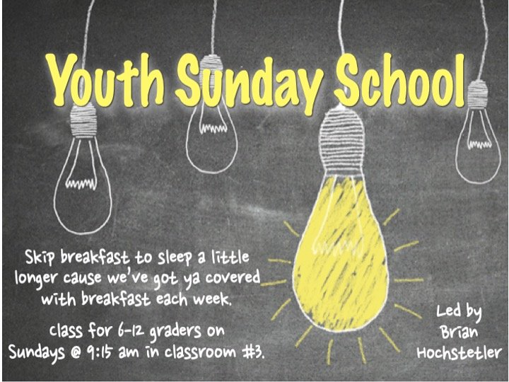 - Sundays @ 9:15 am: Sunday School Classes for all ages